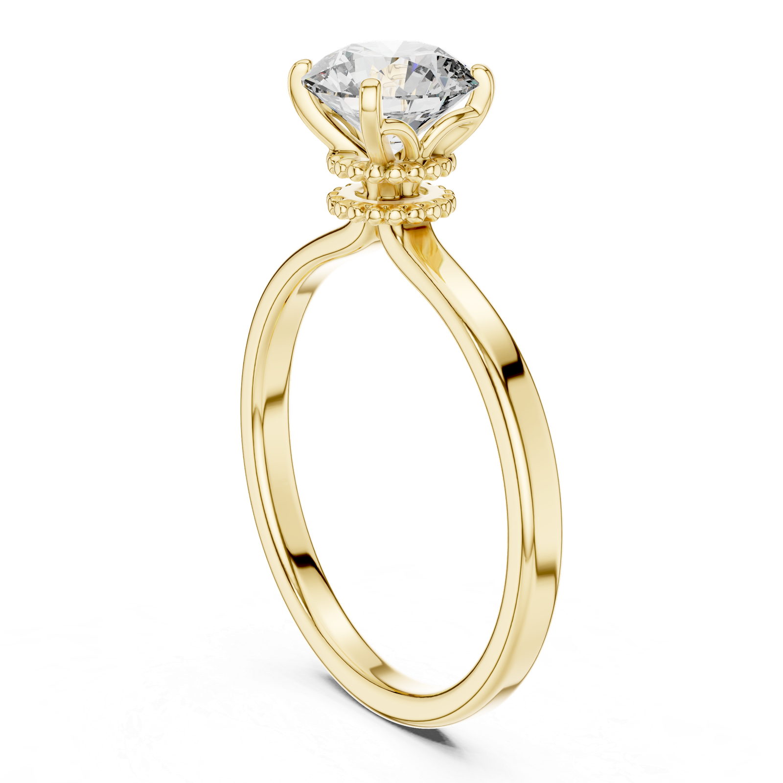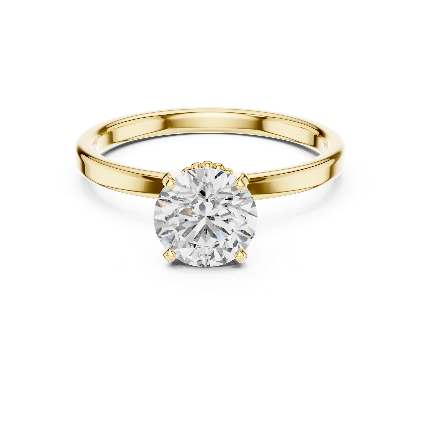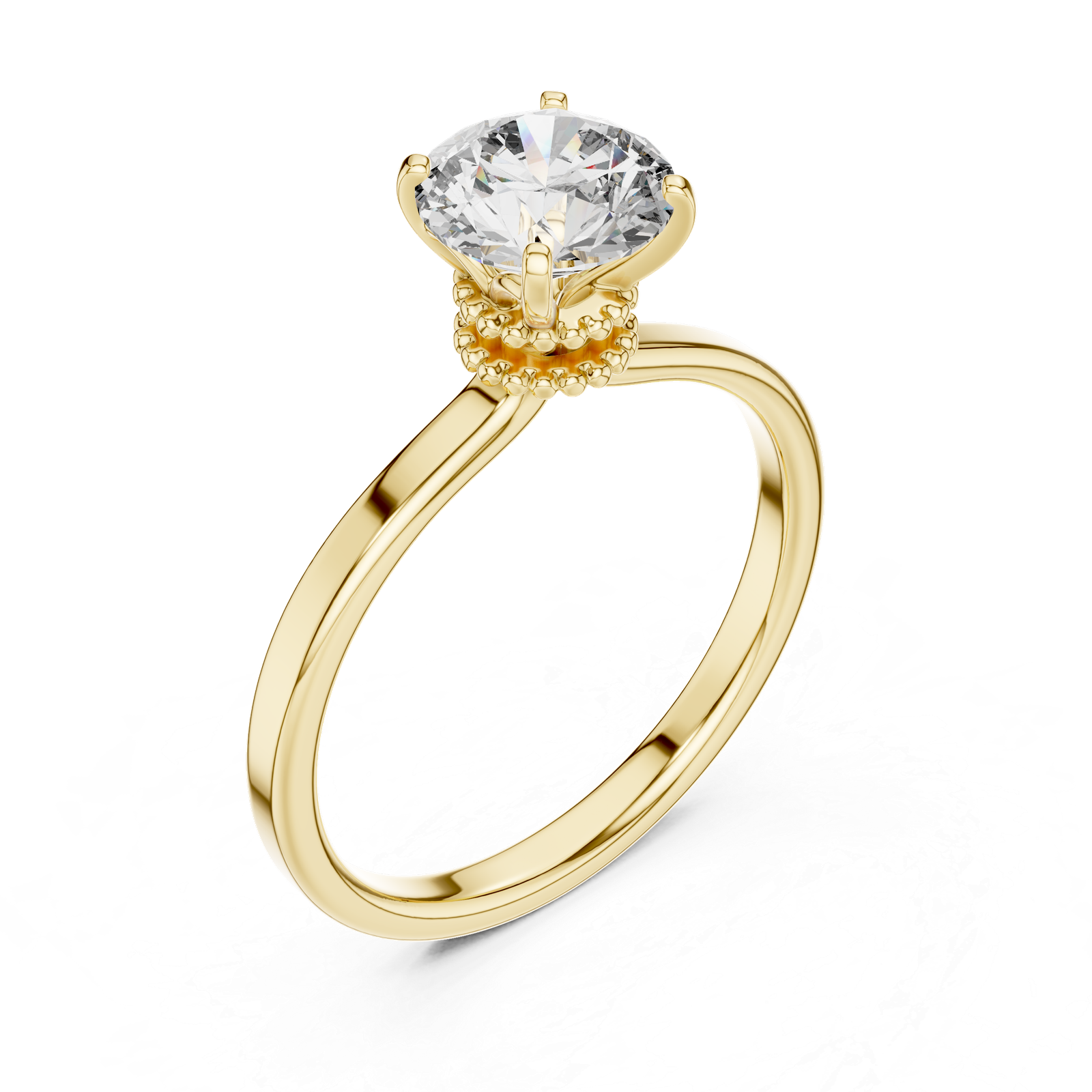 This exquisite solitaire engagement ring features a timeless design with a modern twist. Crafted in lustrous, the ring showcases a dazzling round brilliant-cut diamond securely held by four prongs. Beneath the center stone, a delicate beaded halo adds an intricate touch of elegance and vintage charm, drawing the eye to the diamond's brilliance. The sleek, polished band ensures the focus remains on the stunning centerpiece, making this ring a perfect symbol of enduring love and refined style.