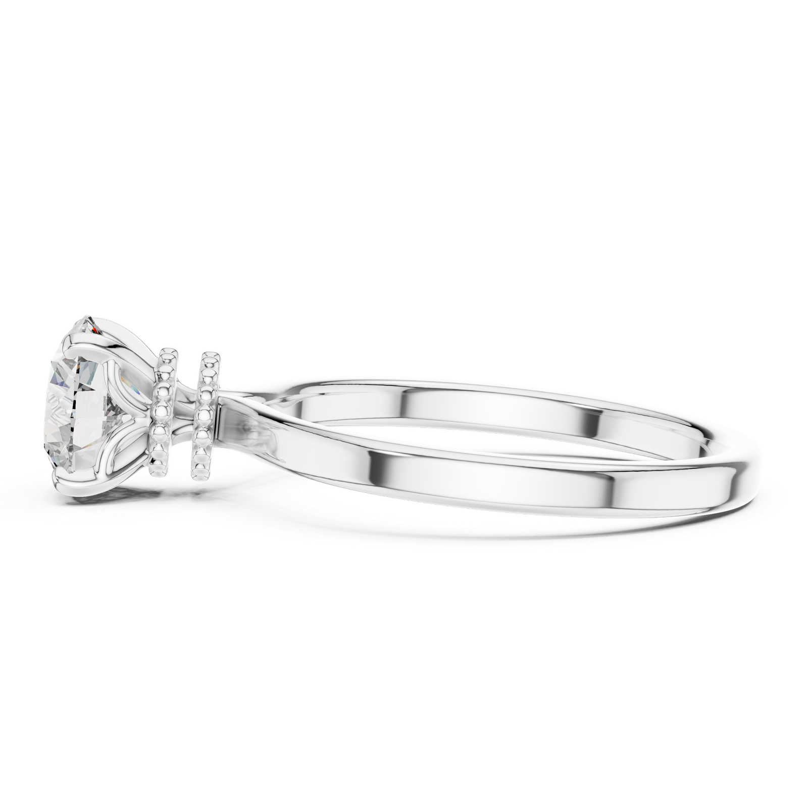 Setting: Four-prong solitaire with beaded halo detail