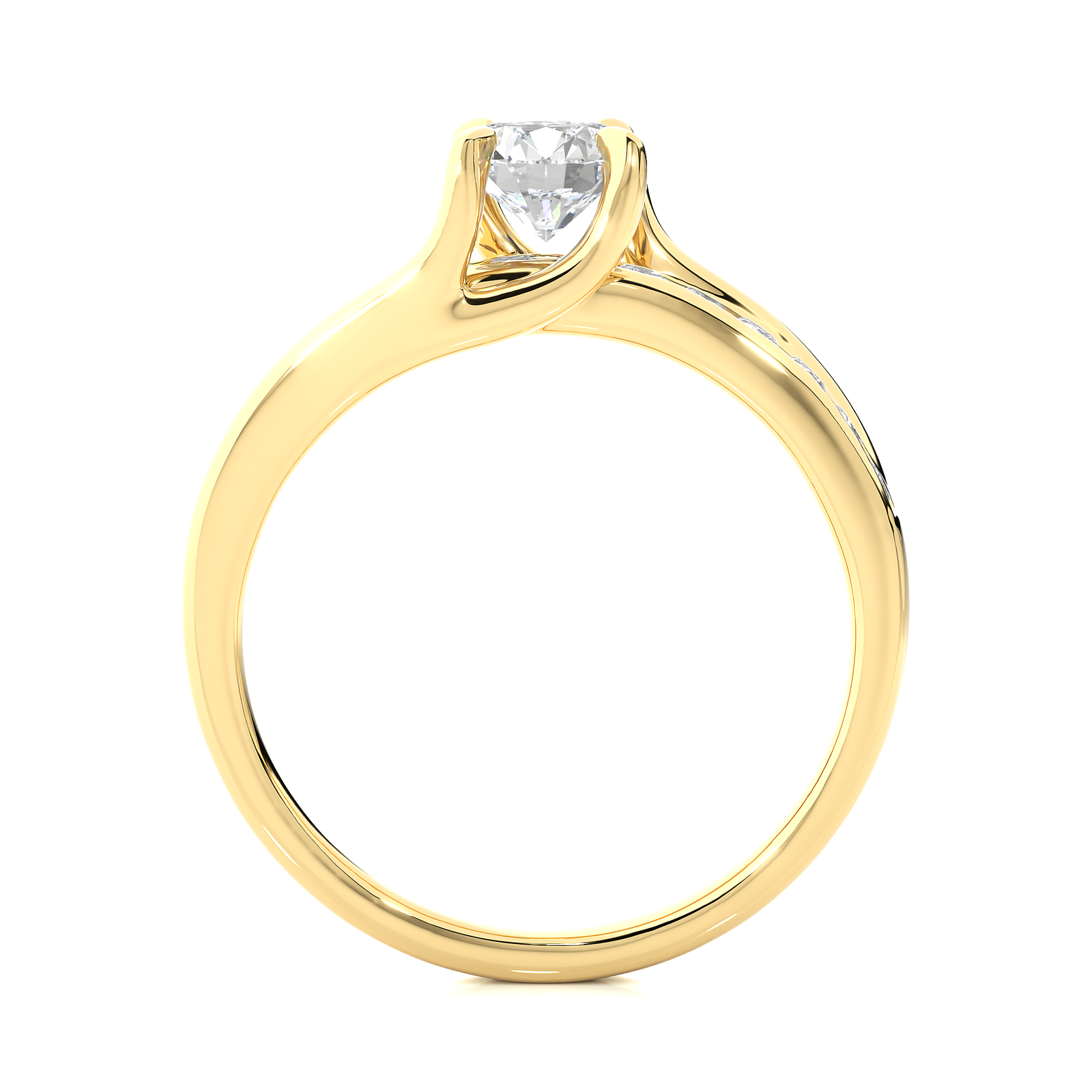 This contemporary engagement ring showcases a brilliant round-cut center diamond held by sleek split prongs. Channel-set diamonds elegantly line the band, creating a seamless sparkle that blends classic sophistication with modern design. Crafted in lustrous white gold, this ring is a striking symbol of love, commitment, and timeless style.