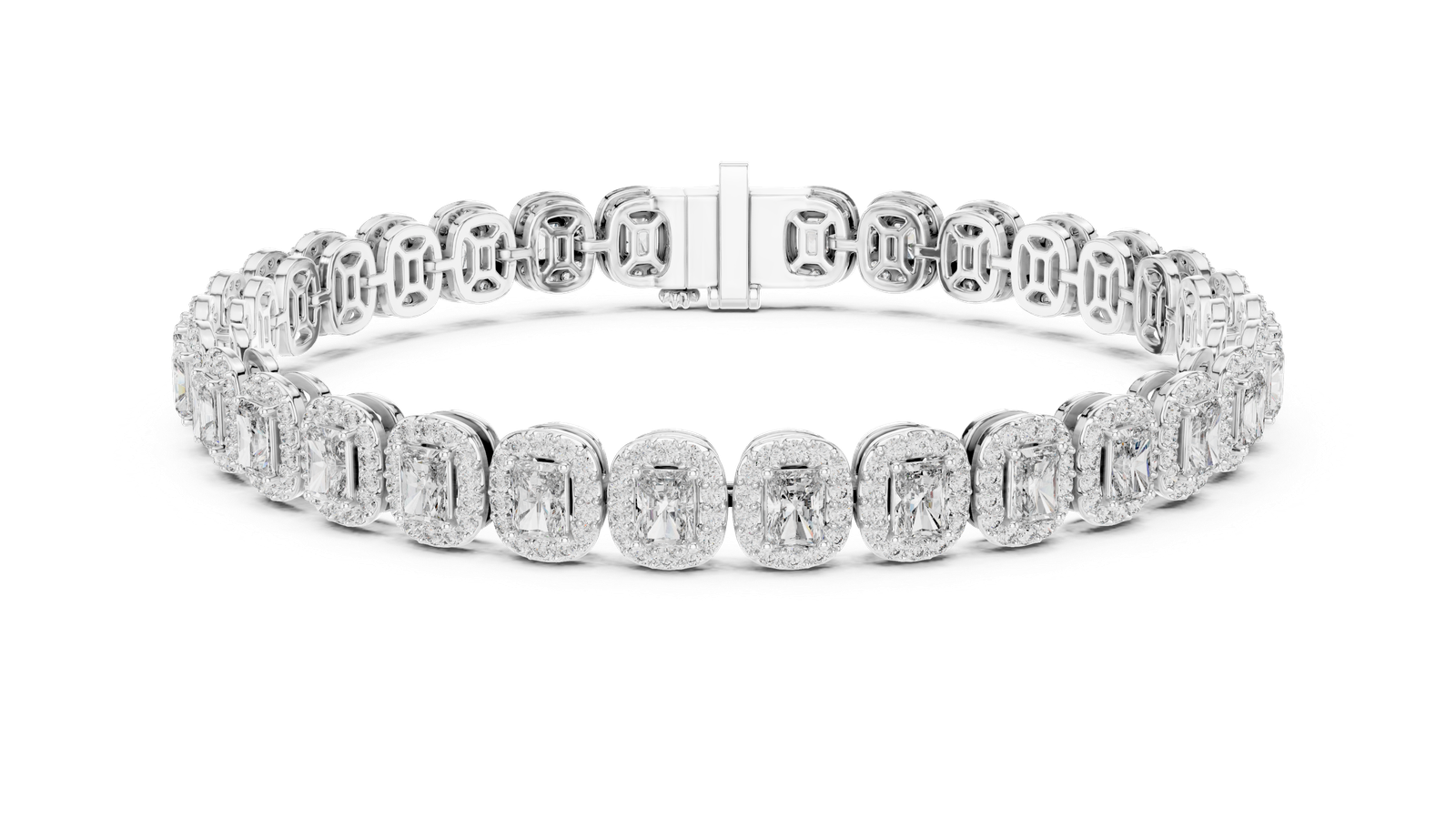 Elevate your jewelry collection with this show-stopping emerald-cut halo diamond bracelet, masterfully set in rich 18K yellow gold. Each link showcases a radiant emerald-cut diamond framed by a brilliant halo of round-cut diamonds, creating a luxurious and light-catching effect from every angle. The elegant craftsmanship and bold design make this piece a true statement of sophistication and glamour. Center Stones: Emerald-Cut Diamonds Accent Stones: Round Brilliant Diamonds Design: Linked halo settings for seamless sparkle Clasp: Secure hidden box clasp with safety latch Perfect For: Black-tie events, milestone gifts, or heirloom-quality luxury Setting Style: Halo Setting with Prong and Link Construction ? Each emerald-cut diamond is surrounded by a glittering halo of round brilliants, held securely in prong settings and connected via polished, openwork gold links for fluid movement and all-around brilliance.
