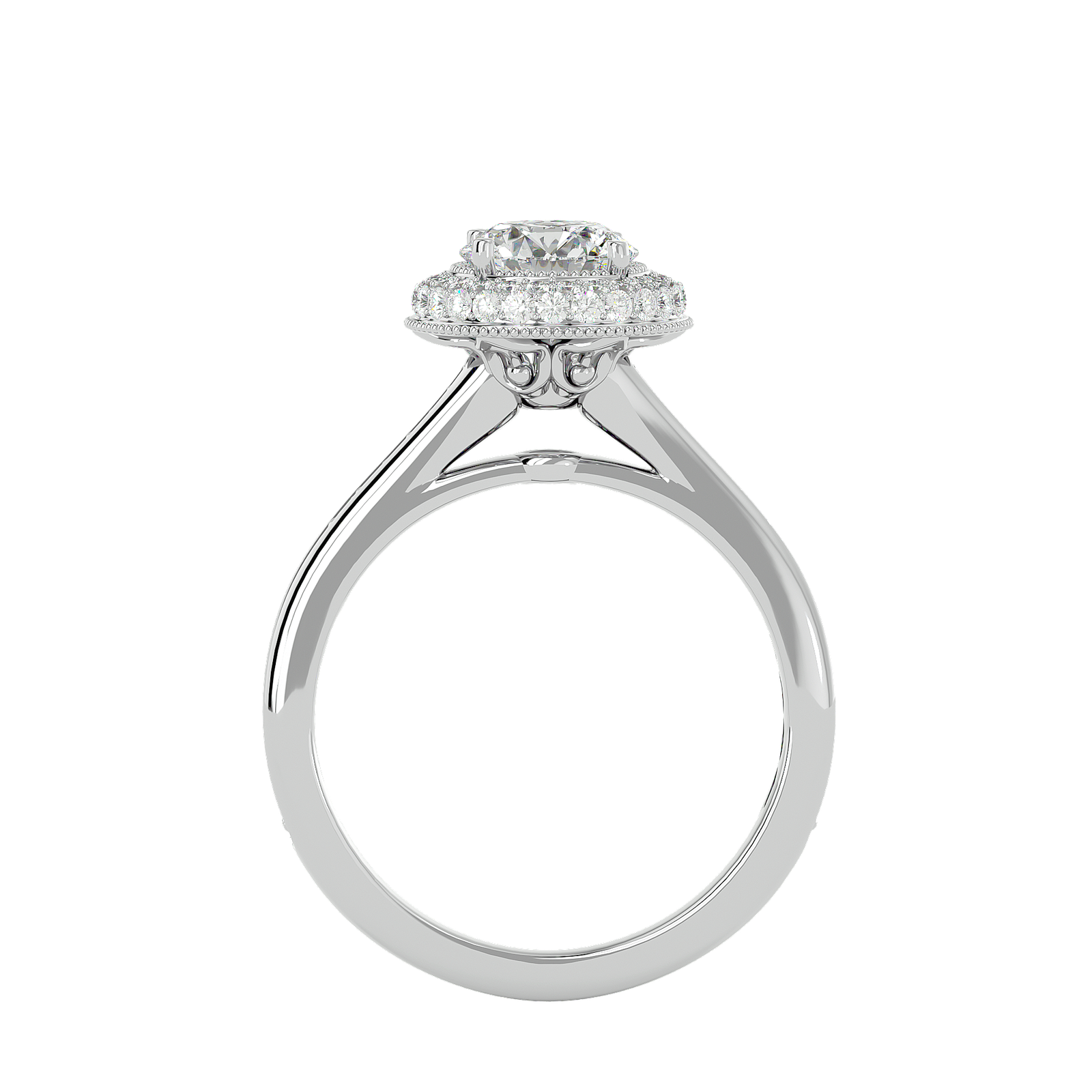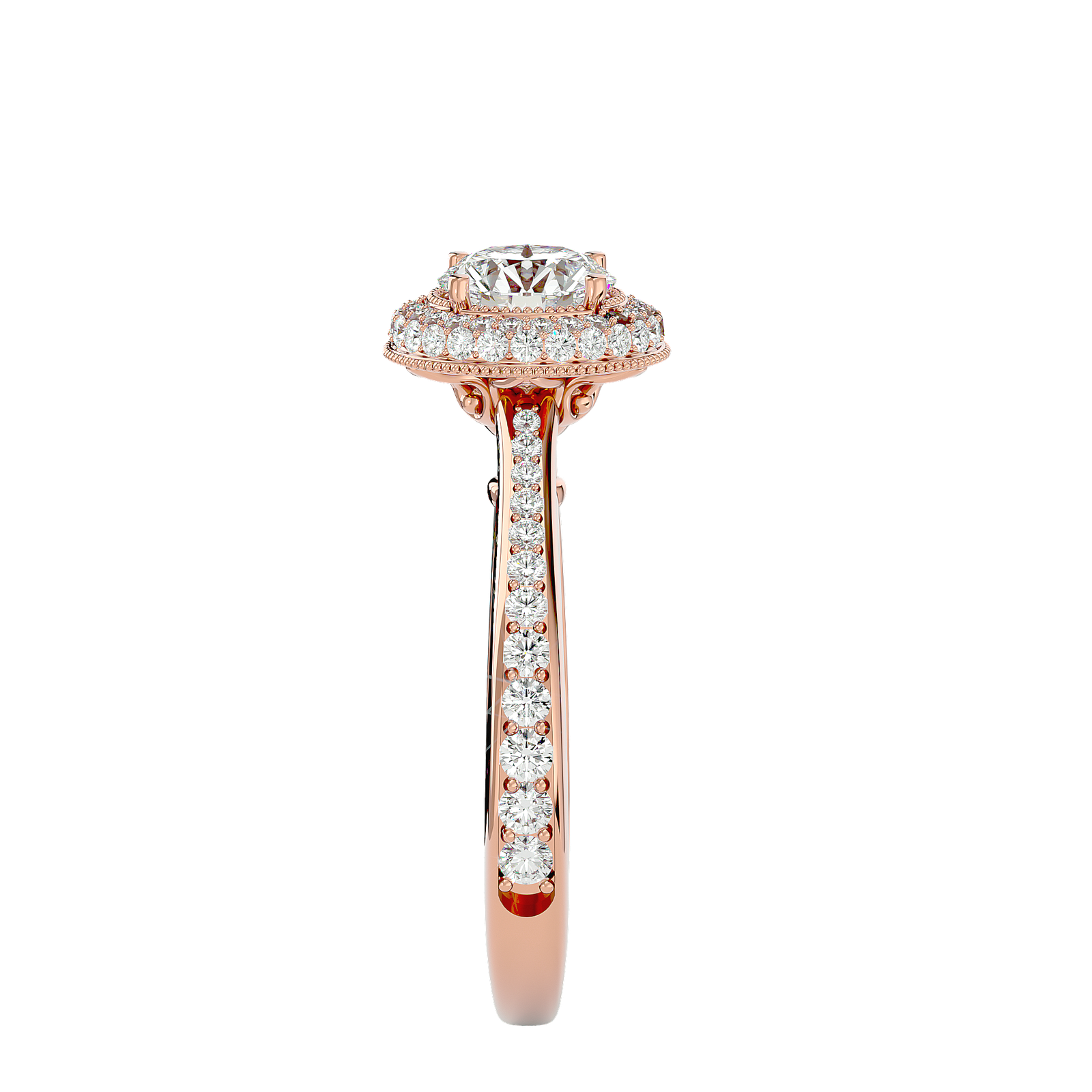 Exude timeless romance with this elegant solid gold engagement ring. Featuring a brilliant round-cut center diamond surrounded by a double halo of shimmering accent stones, the band sparkles with pavé-set diamonds. The warm rose gold setting enhances its vintage charm—perfect for celebrating eternal love with classic sophistication and radiant brilliance.