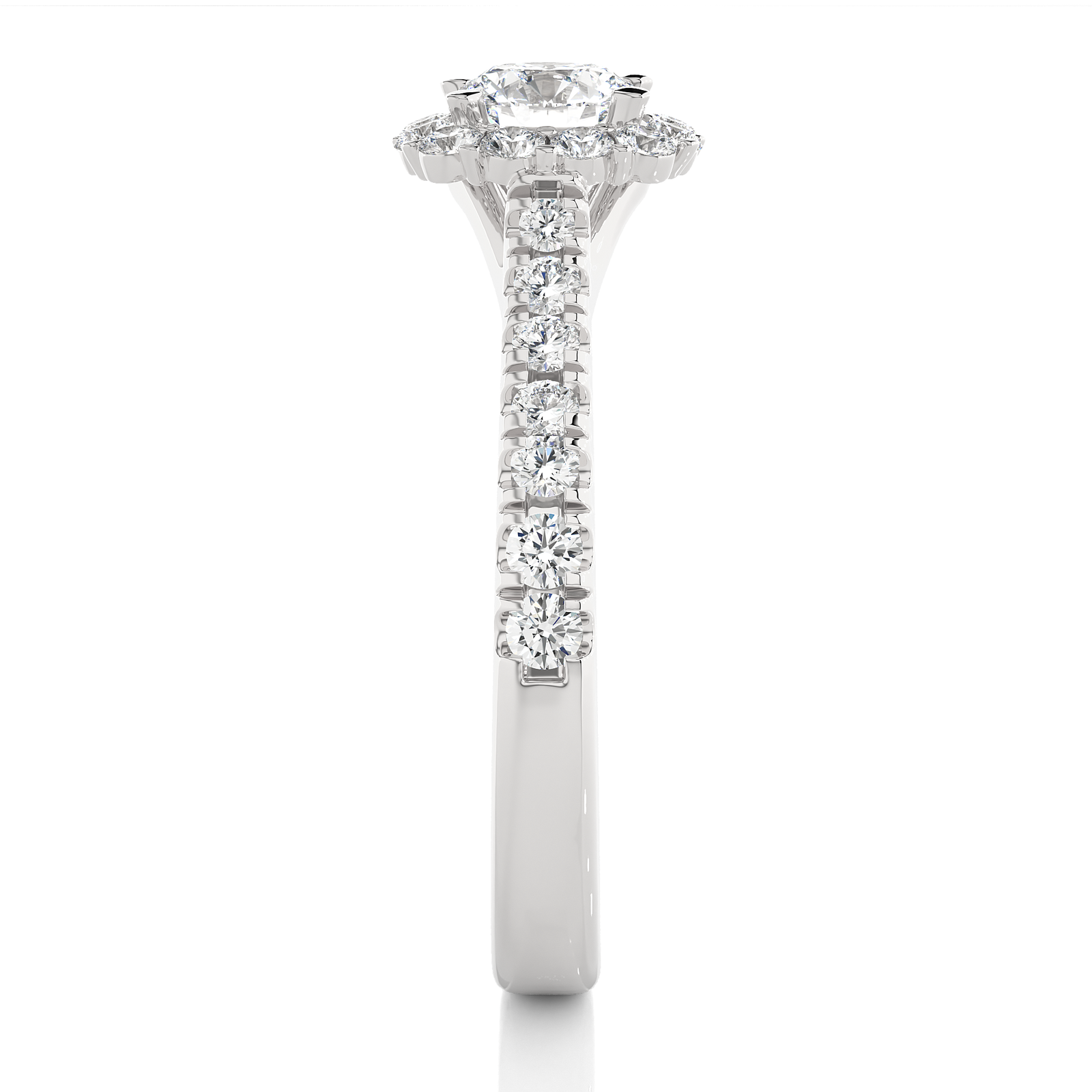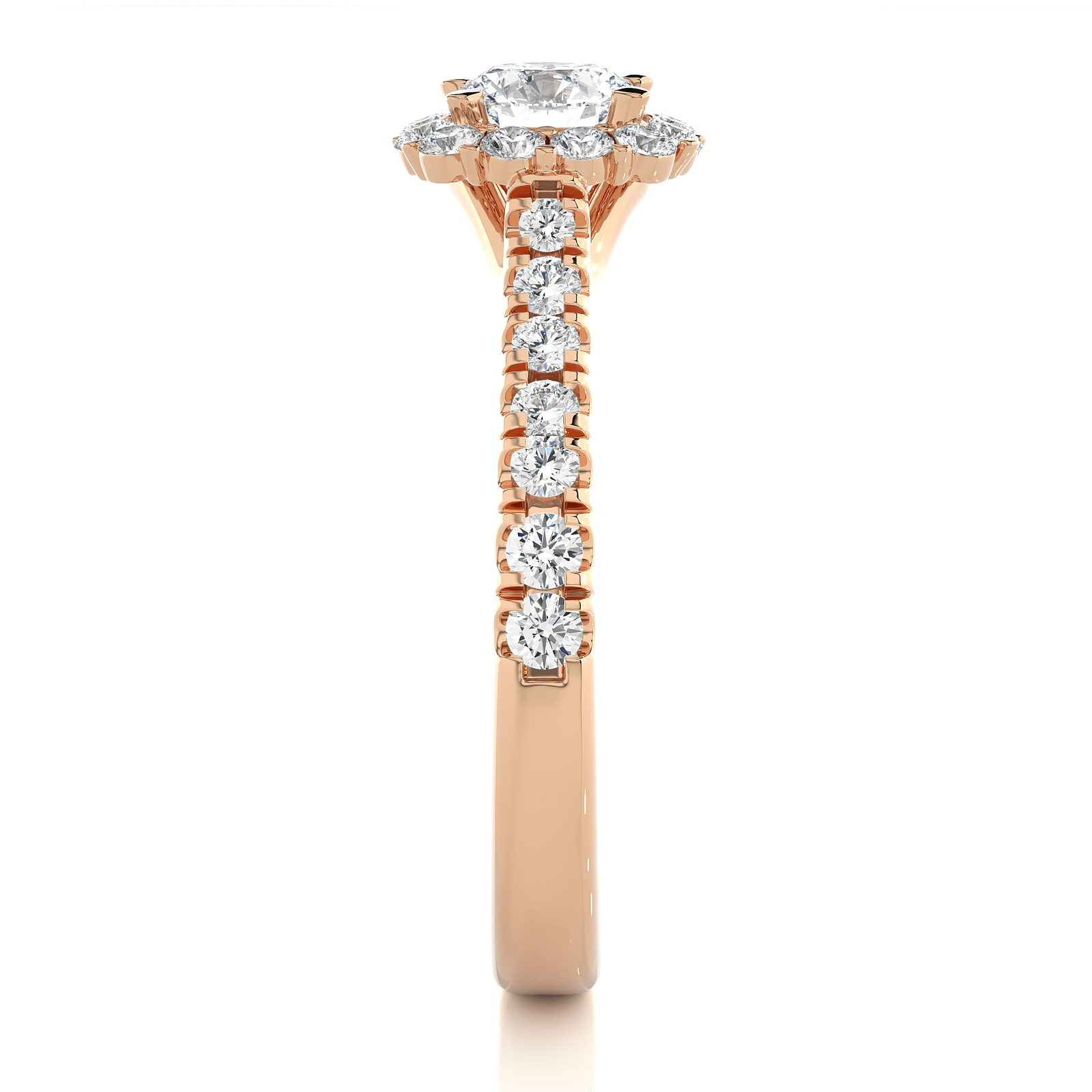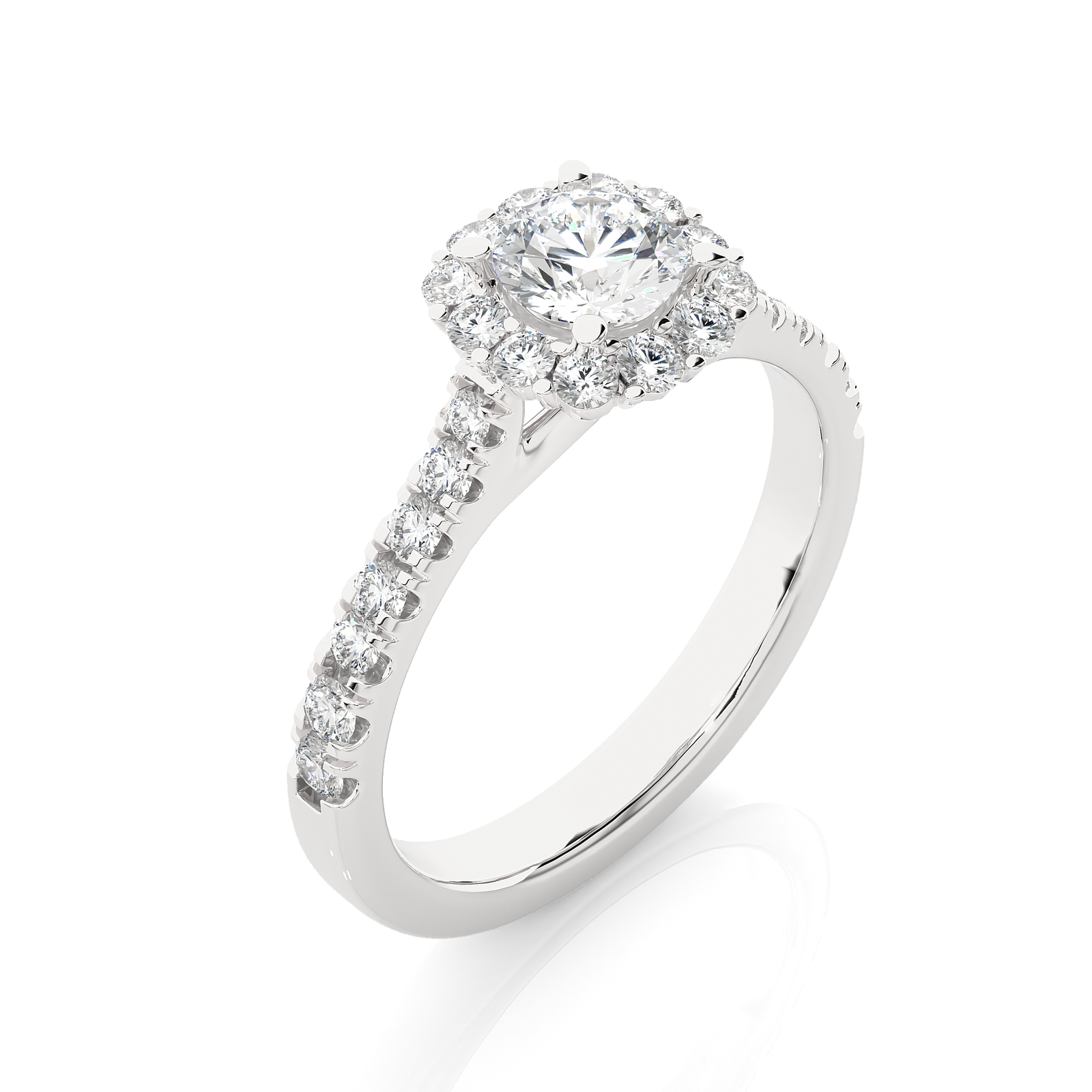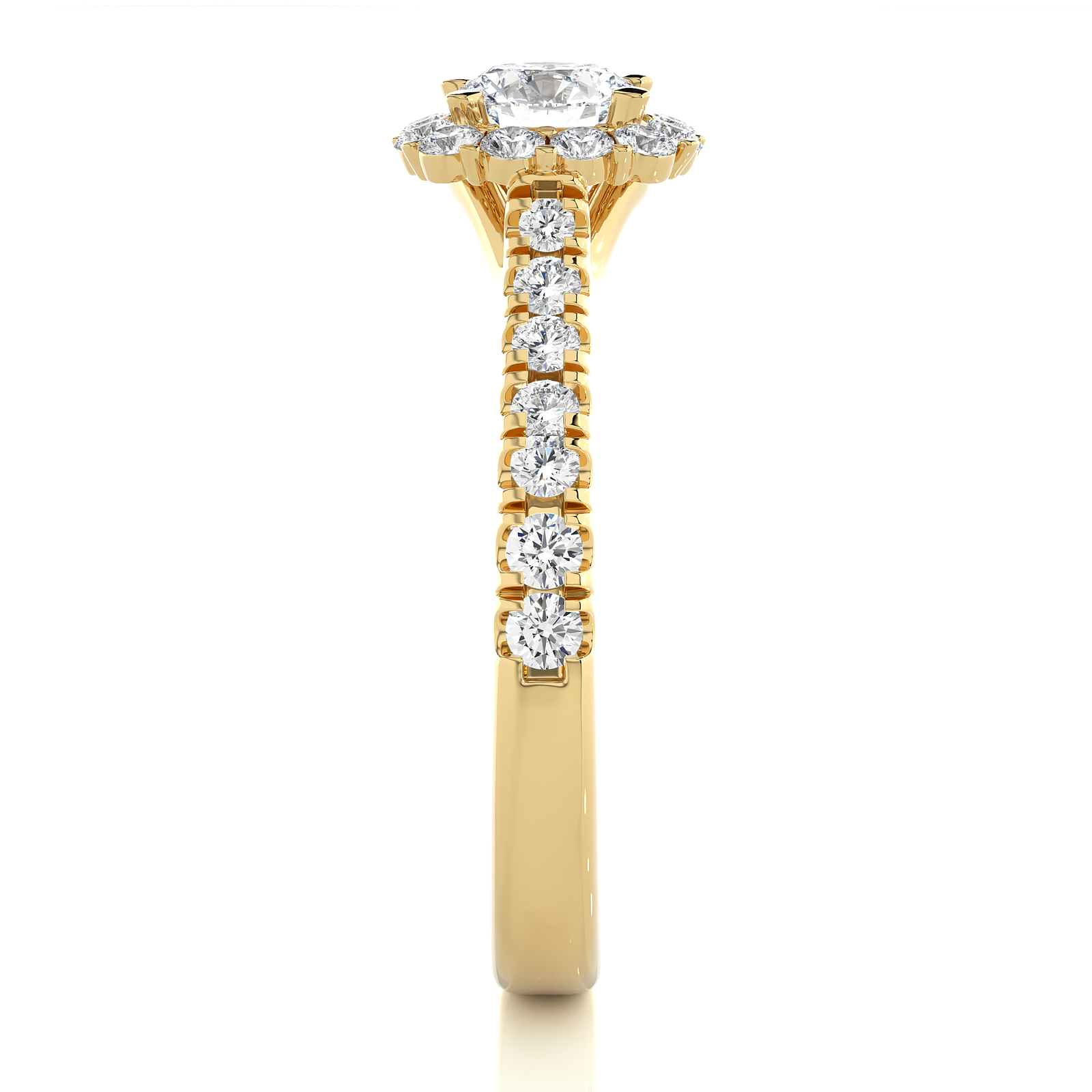 Elegance meets brilliance in this classic gold engagement ring. A dazzling round-cut center diamond is beautifully framed by a halo of sparkling diamonds, with additional diamonds adorning the band for added glamour. Timeless and radiant, this ring is a perfect symbol of love and commitment, designed to shine forever.