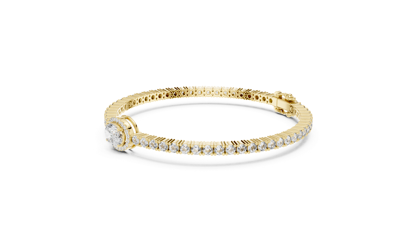 A timeless statement of elegance and brilliance, this luxurious tennis bracelet showcases a captivating oval-cut center diamond framed by a halo of petite round diamonds for extra sparkle. The center motif is flanked by a continuous stream of round brilliant-cut diamonds, each meticulously set in gleaming 18K yellow gold. Designed with precision and crafted for sophistication, this bracelet combines classic charm with modern refinement?ideal for celebratory occasions or enhancing your daily elegance. Centerpiece: Oval-Cut Diamond with Halo Diamond Accents: Round Brilliant-Cut Diamonds Clasp: Secure Box Clasp with Safety Latch Occasions: Perfect for weddings, anniversaries, and formal events Setting Style: Center Diamond: Halo Setting ? The oval center diamond is encircled by a halo of smaller round diamonds, amplifying its size and sparkle. Side Diamonds: Four-Prong Setting ? Each round diamond is individually held in a secure four-prong setting for a clean, elegant look.