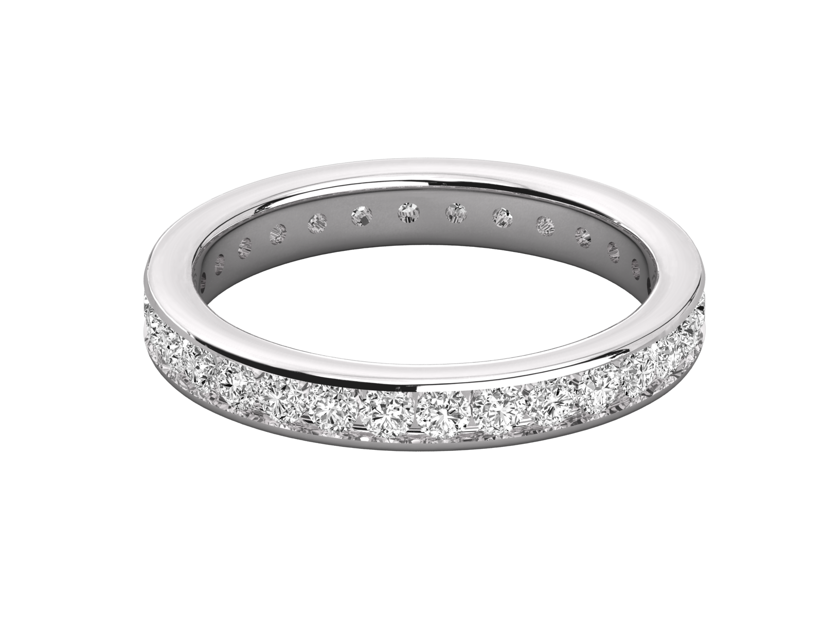 This elegant eternity band features a sleek channel setting, cradling a continuous row of brilliant round-cut diamonds in polished white gold. A modern yet timeless design, it offers durability and dazzling sparkle. Perfect as a wedding band, anniversary gift, or a luxurious symbol of everlasting love and commitment.