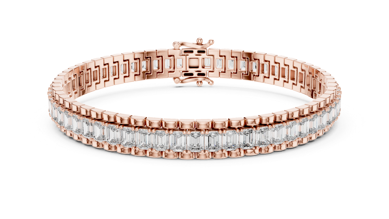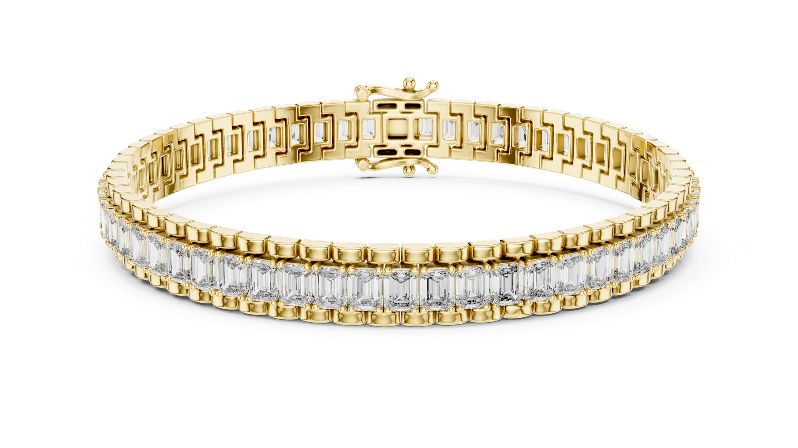 Elevate your elegance with this stunning tennis bracelet, featuring a continuous row of meticulously set baguette-cut diamonds. The sleek, geometric brilliance of each diamond is framed in a luxurious gold setting, offering a bold yet timeless look. Whether worn alone or stacked, this bracelet is a refined statement of luxury and craftsmanship. Material: gold stone: emerald -Cut Diamonds Clasp: Secure Box Clasp with Safety Latch Style: Classic Tennis Bracelet Occasion: Perfect for weddings, anniversaries, and formal events