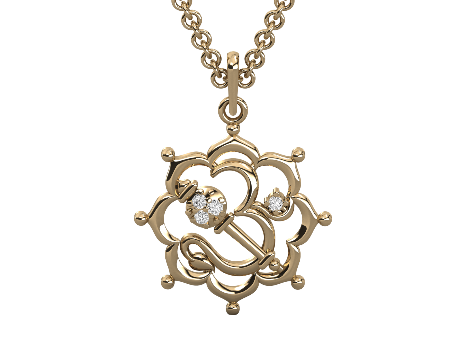 Grace meets spirituality in this intricately crafted gold pendant, featuring a radiant Om symbol enclosed within a blooming lotus design. Sparkling diamond accents add a divine brilliance, making it a perfect blend of tradition and elegance. Ideal for daily wear or gifting, this pendant symbolizes peace, purity, and inner strength.