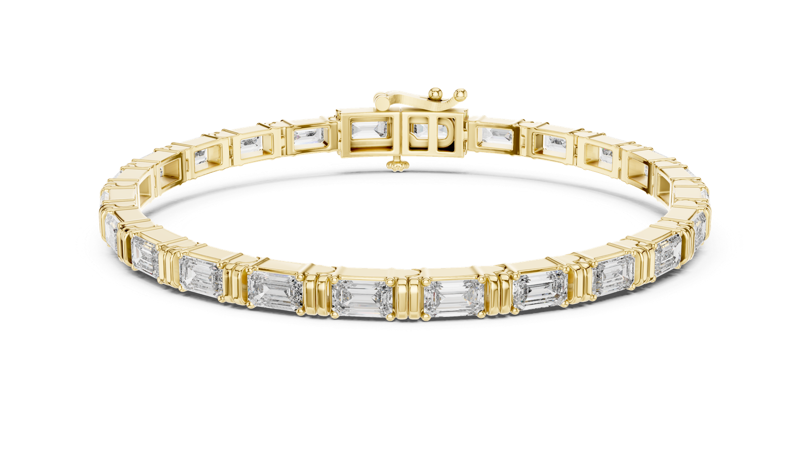 A bold reinterpretation of the classic tennis bracelet, this exquisite piece is crafted from luminous 18K yellow gold and showcases a series of perfectly matched emerald-cut diamonds. Each stone is individually set between double-prong gold mounts, allowing light to reflect brilliantly from every angle. The substantial gold links add both visual weight and luxury, making this bracelet an iconic statement of style and elegance. Material: 18K Yellow Gold stone: Emerald-Cut Diamonds Setting: Double Prong Setting Clasp Type: Secure Box Clasp with Figure-Eight Safety Style: Modern Luxe with a Classic Twist Occasion: Black-tie Events, Milestone Celebrations, Luxury Gifts
