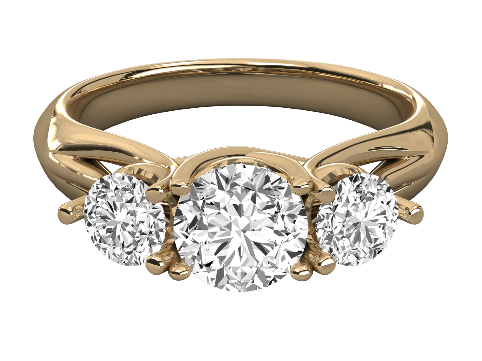 This elegant three-stone ring. Featuring brilliant round diamonds set in warm yellow gold, this timeless design symbolizes everlasting love. The gracefully split shank adds a modern touch, making it a perfect choice for engagements, anniversaries, or meaningful milestones. Classic, radiant, and unforgettable.