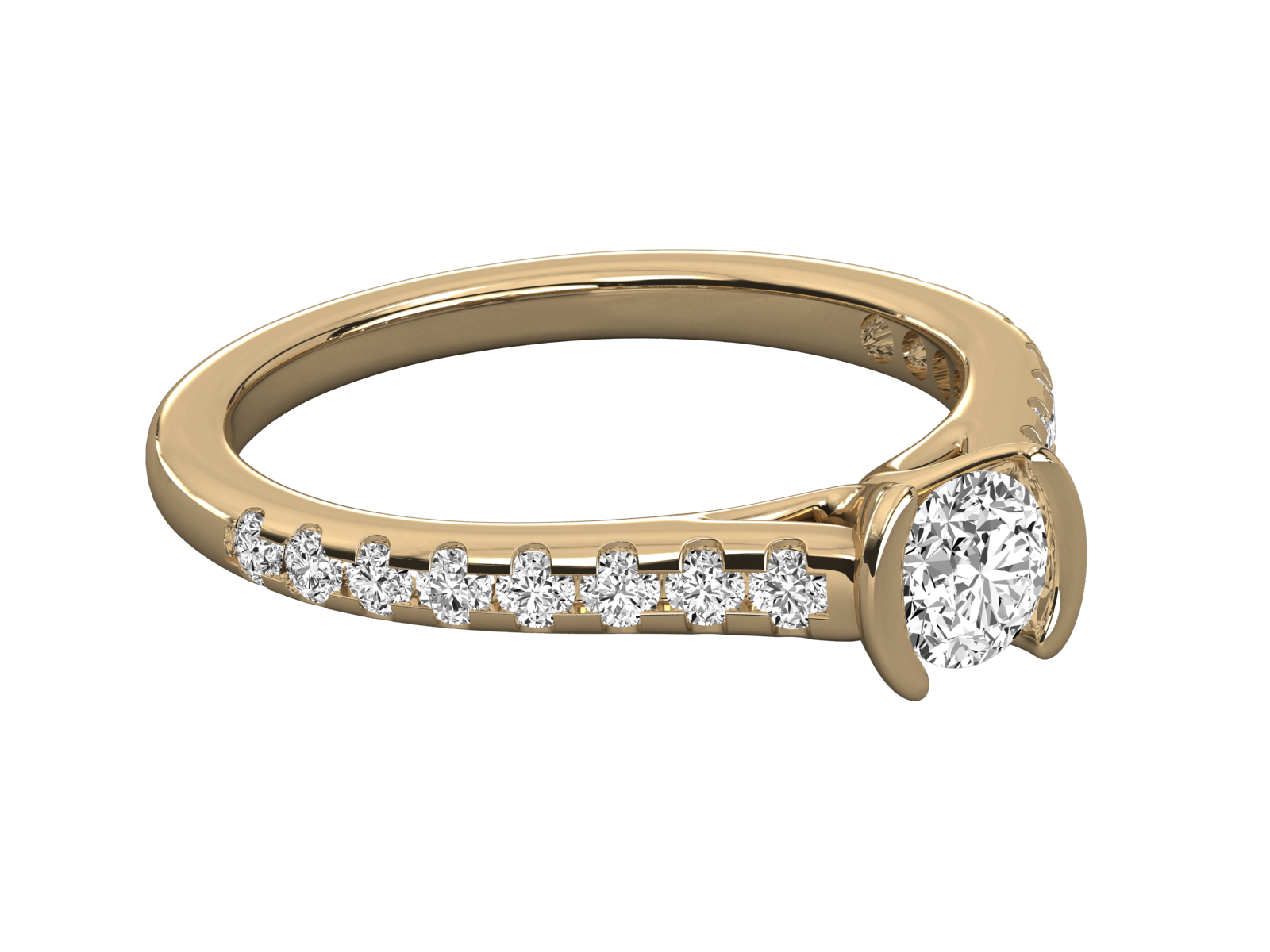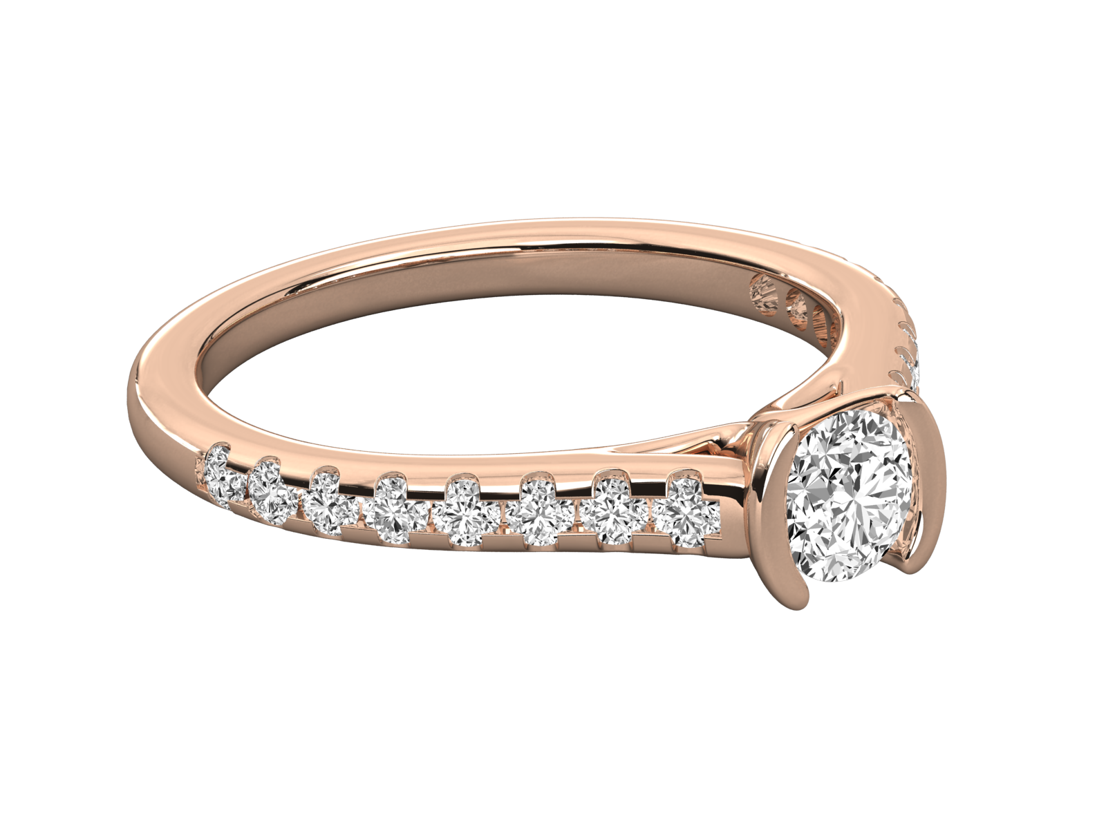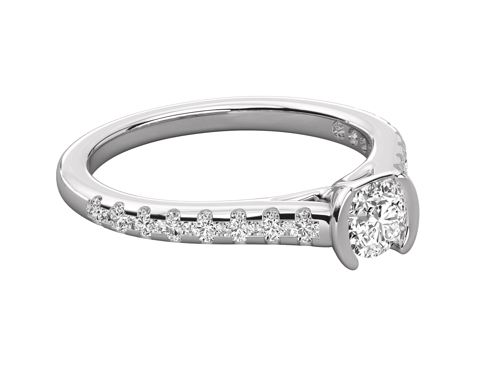 This exquisite engagement ring showcases a brilliant round-cut diamond in a secure half-bezel setting. The band features a row of sparkling channel-set diamonds, adding elegance and brilliance. A perfect blend of modern design and timeless beauty, symbolizing everlasting love and refined sophistication.