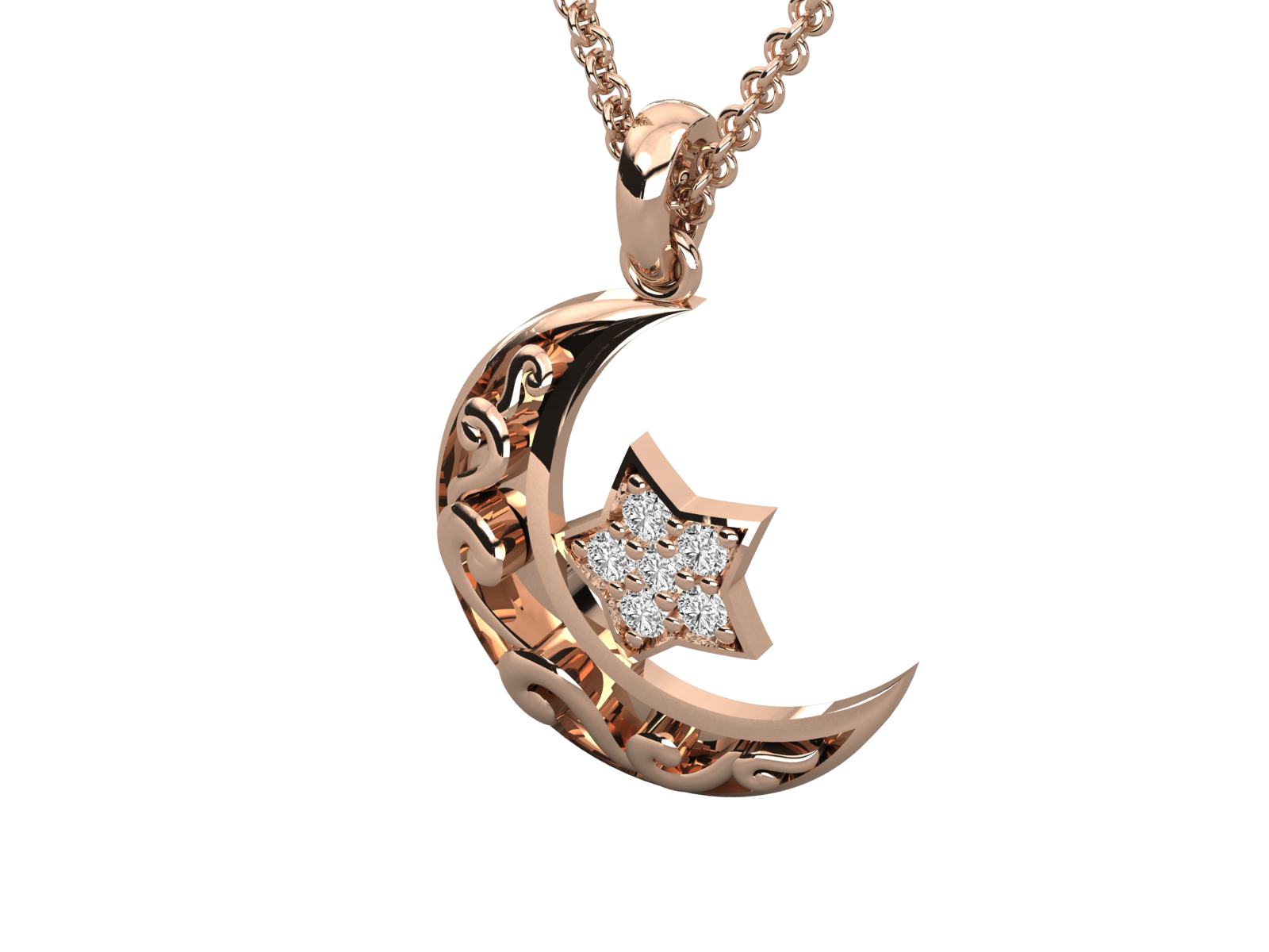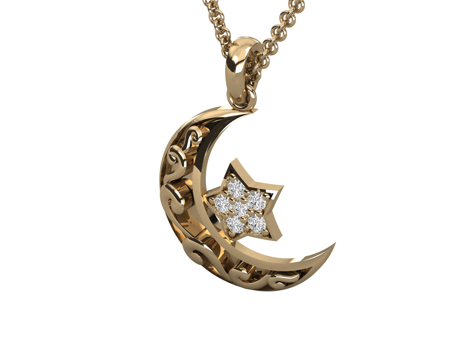 This stunning gold crescent moon and star pendant, adorned with sparkling diamonds. Featuring intricate floral scrollwork, it makes a meaningful gift for Ramadan, Eid, or spiritual occasions. A timeless celestial design perfect for daily wear or special celebrations. Includes chain. Symbolic, stylish, and spiritual.