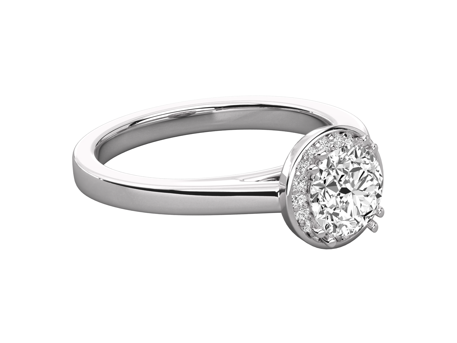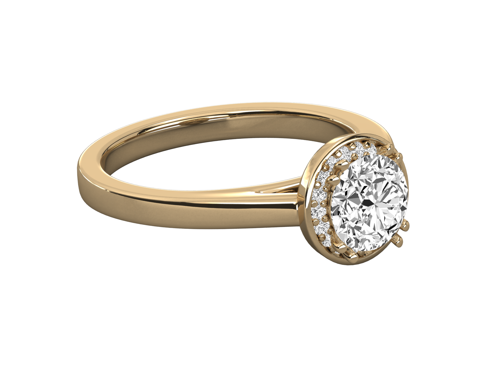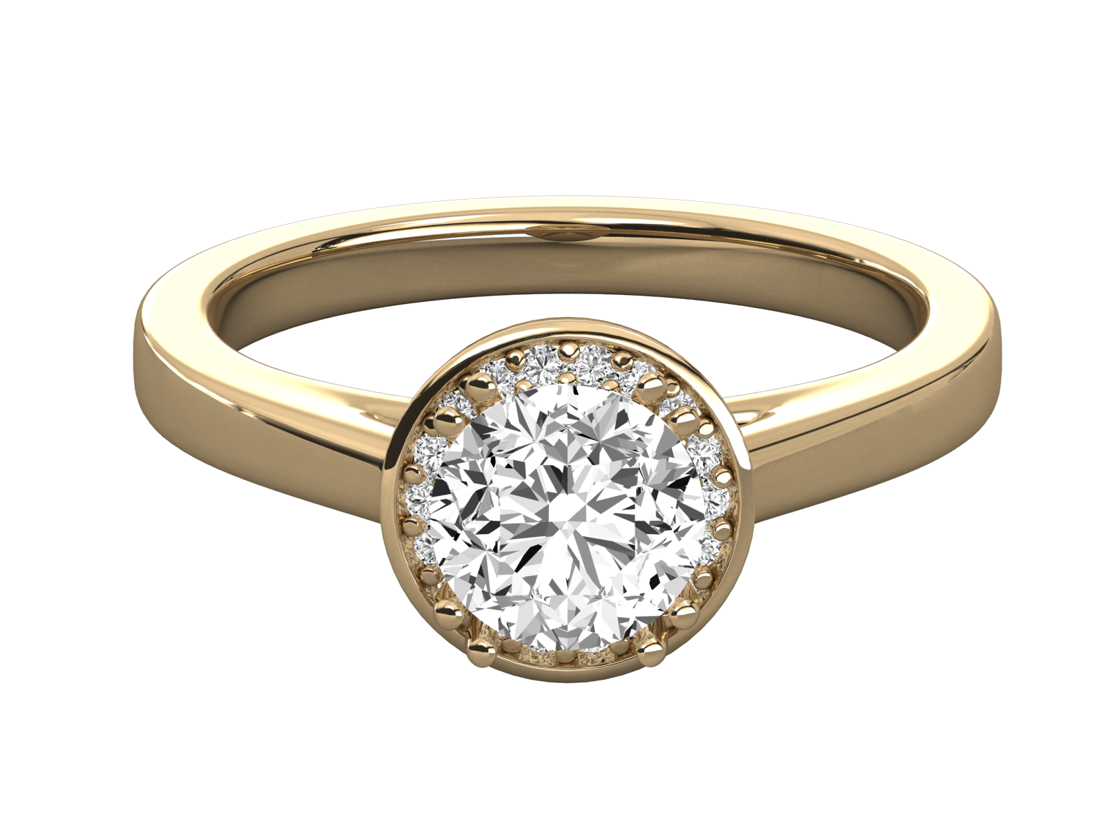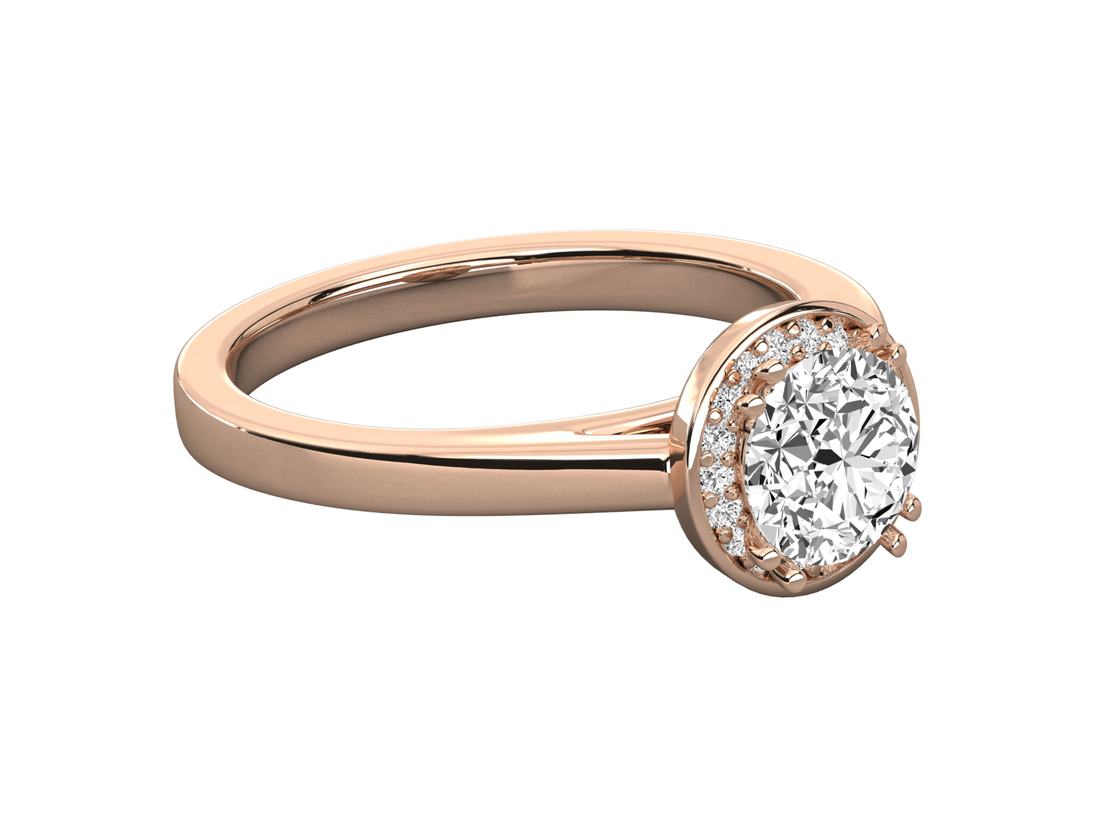 This elegant round halo engagement ring features a dazzling center diamond surrounded by a halo of smaller diamonds, set in warm rose gold. The polished band adds a timeless touch, making it perfect for engagements or special occasions. Classic design meets modern sparkle in this stunning piece.