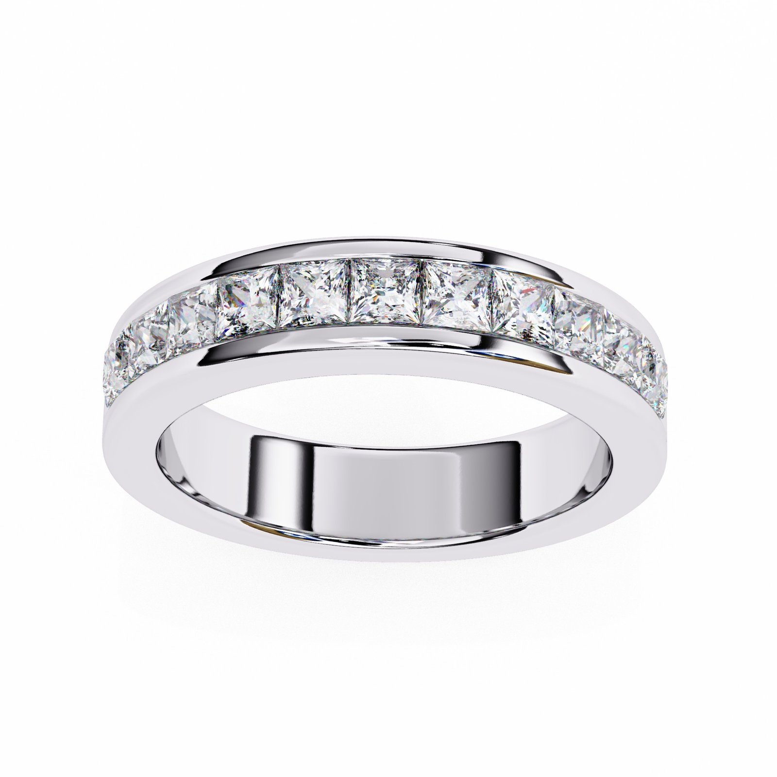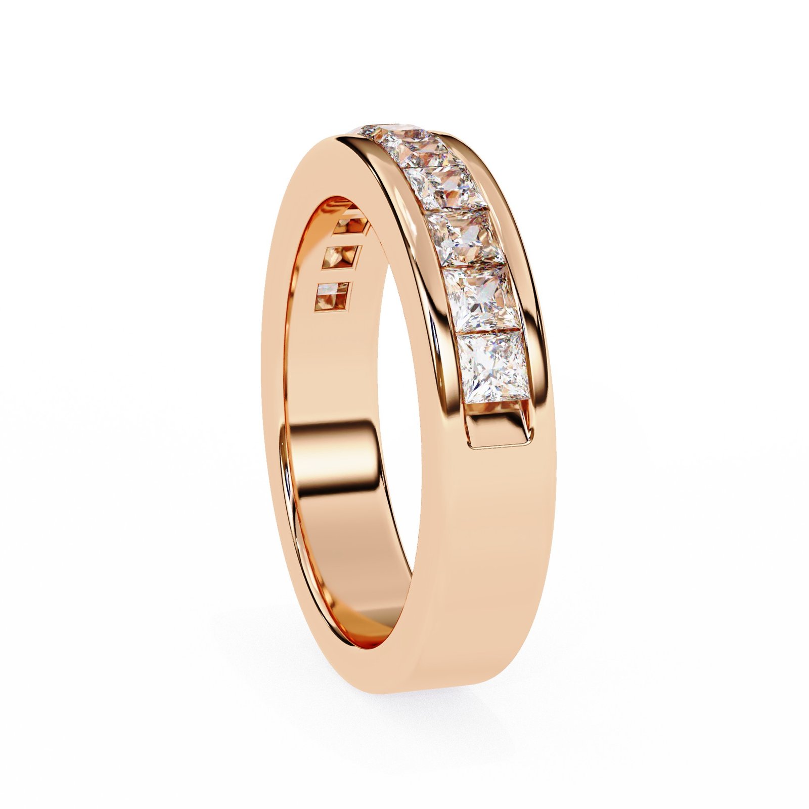 This elegant band features princess-cut diamonds seamlessly channel-set in a sleek yellow gold band. The geometric precision of each stone creates a modern, refined look with maximum sparkle and brilliance. Perfect as a wedding or anniversary ring, this design blends timeless sophistication with contemporary appeal for everyday luxury.