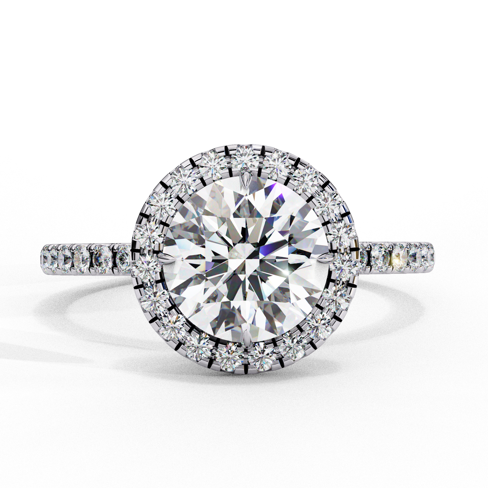 This timeless engagement ring features a brilliant round center diamond encircled by a sparkling halo of pavé-set diamonds. The delicate diamond-studded band enhances its radiance, creating a dazzling display of elegance and romance. A perfect choice for those who cherish sophistication, sparkle, and everlasting beauty.
