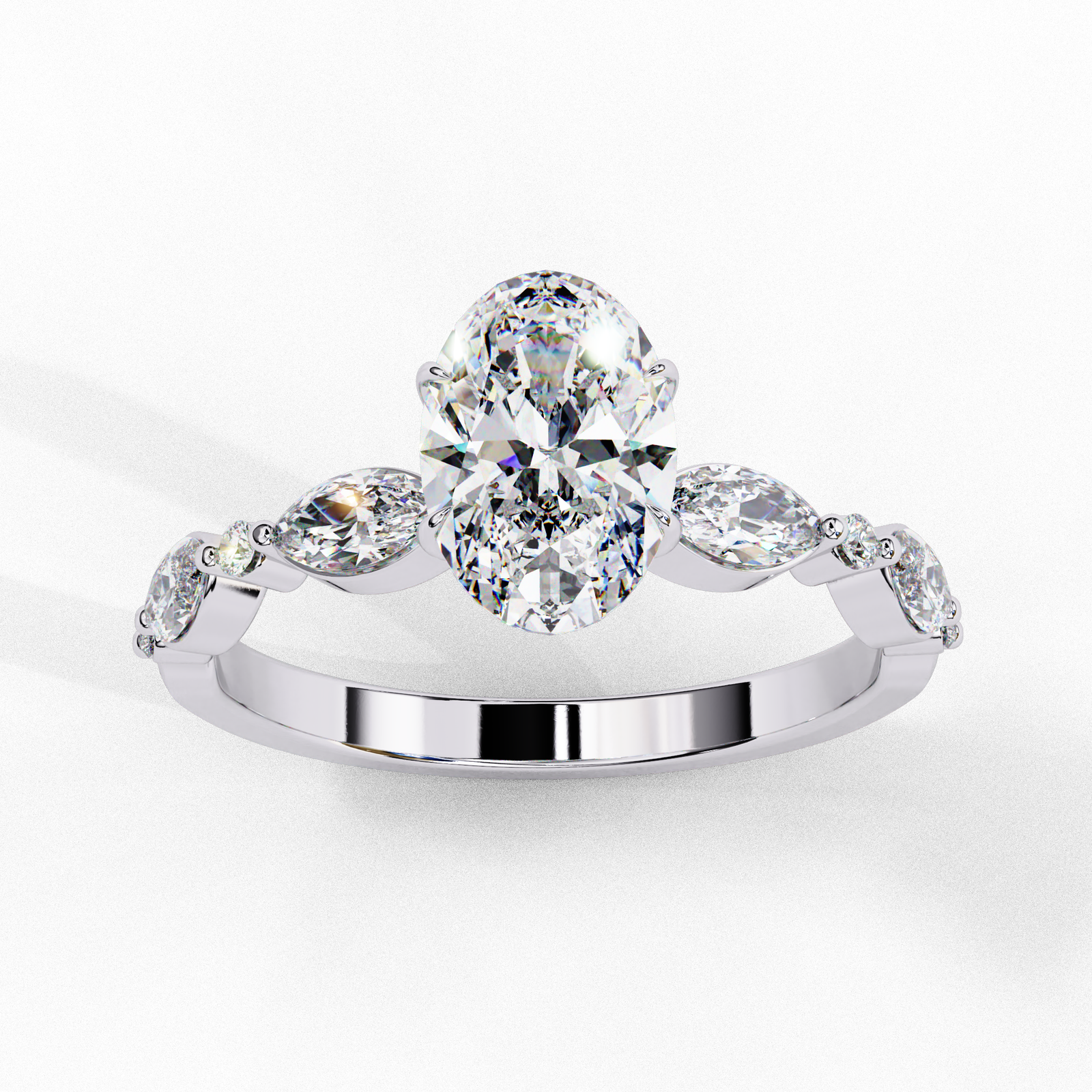 Grace meets brilliance in this stunning oval-cut diamond ring. Set in sleek gold, the radiant center stone is flanked by alternating marquise and round side diamonds for added sparkle. A harmonious blend of classic elegance and modern flair—crafted to celebrate your timeless love with unmatched sophistication.