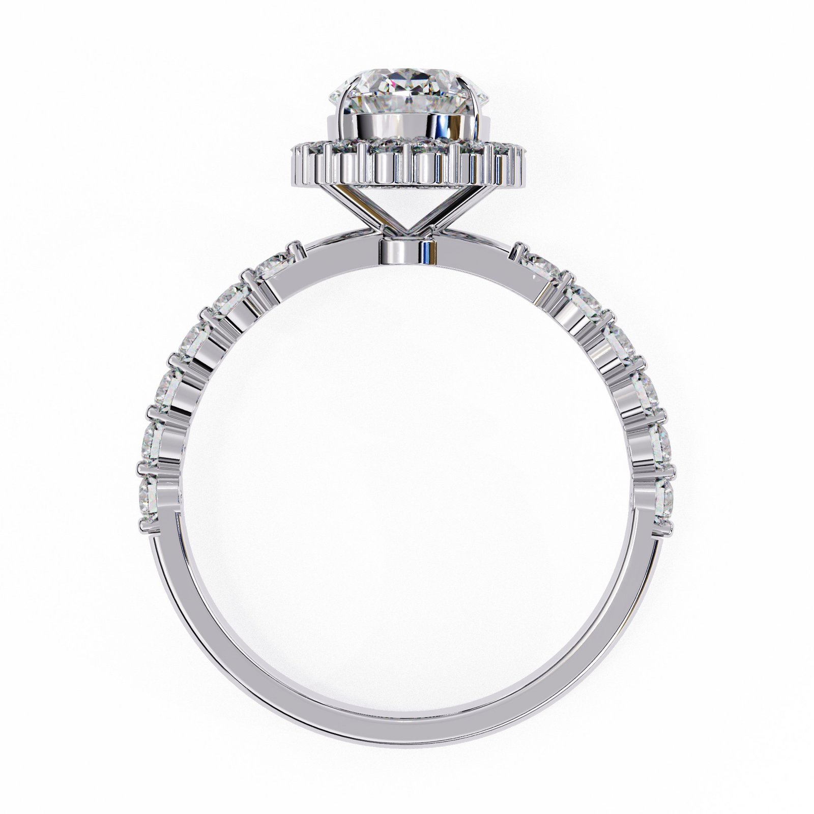 A breathtaking oval-cut diamond takes center stage in this elegant halo ring, framed by a circle of shimmering accent stones. Set in sleek white gold, the band features pavé-set diamonds for extra brilliance. A timeless design that radiates sophistication and charm, perfect for a romantic and enduring engagement.