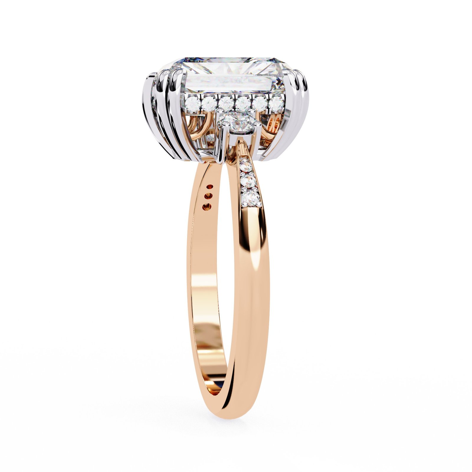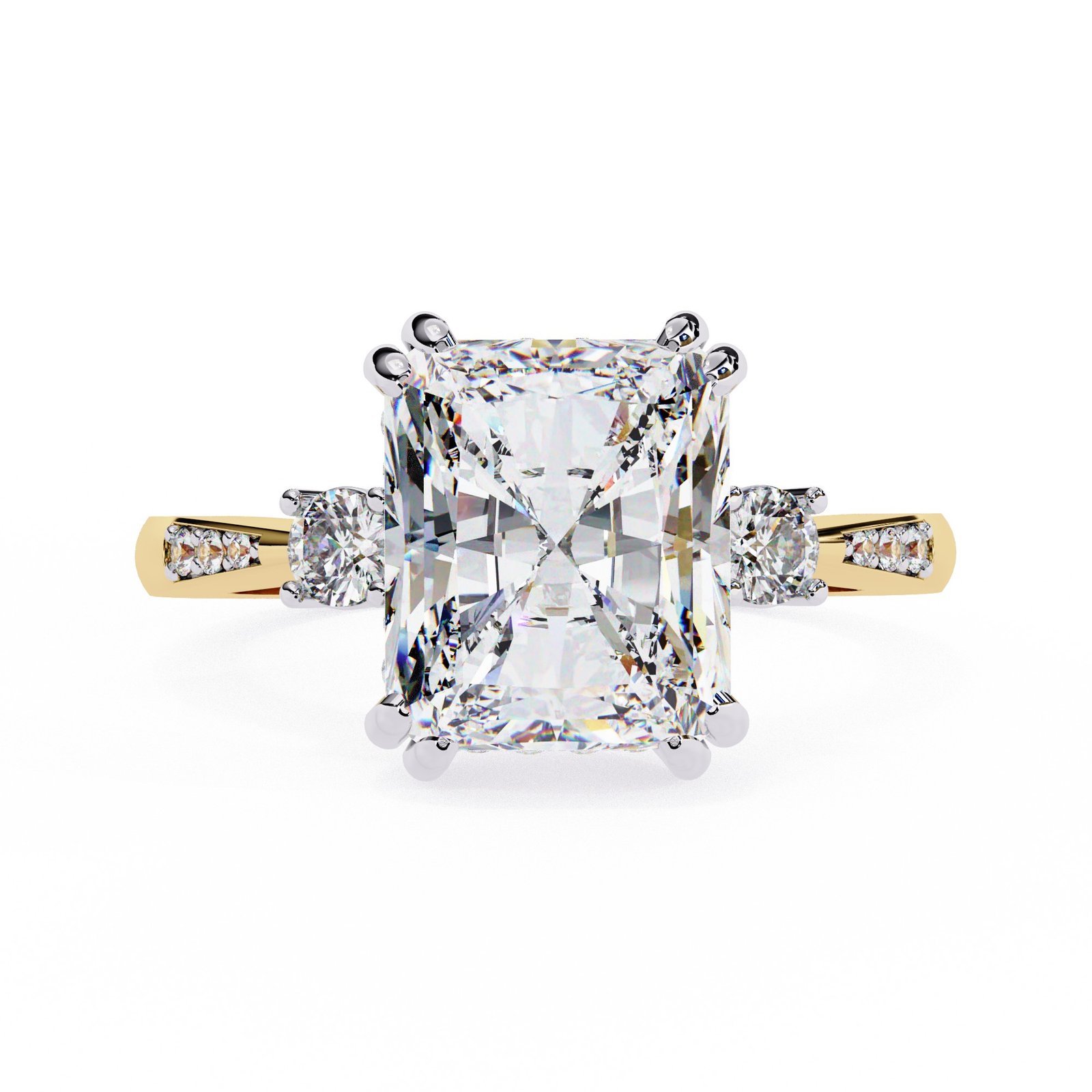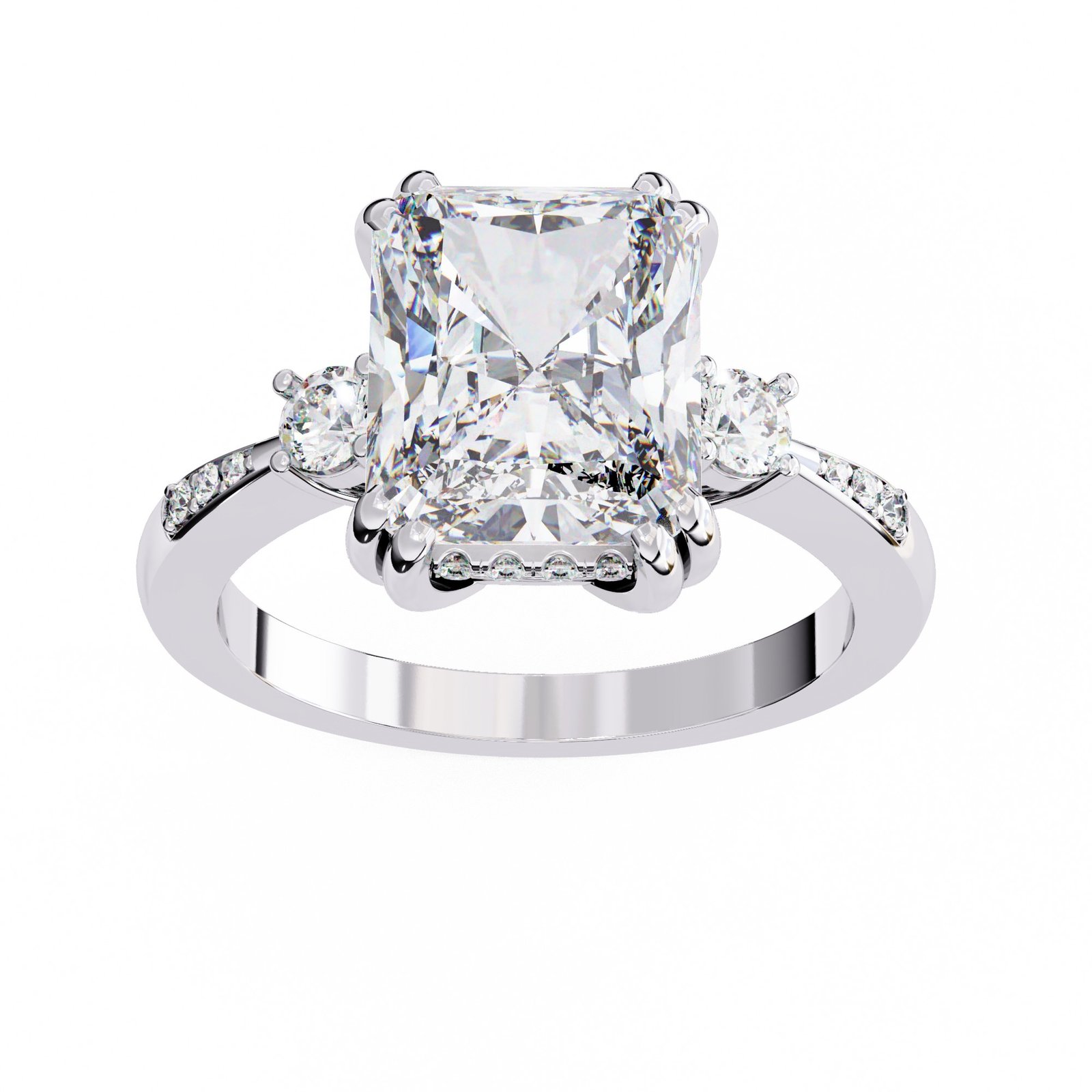This radiant-cut diamond ring dazzles with brilliance and elegance. Set in lustrous white gold or platinum, the centerpiece is flanked by round side stones and accented by pavé diamonds along the band. A vintage-inspired gallery adds charm, making this a stunning symbol of love, style, and timeless sophistication.